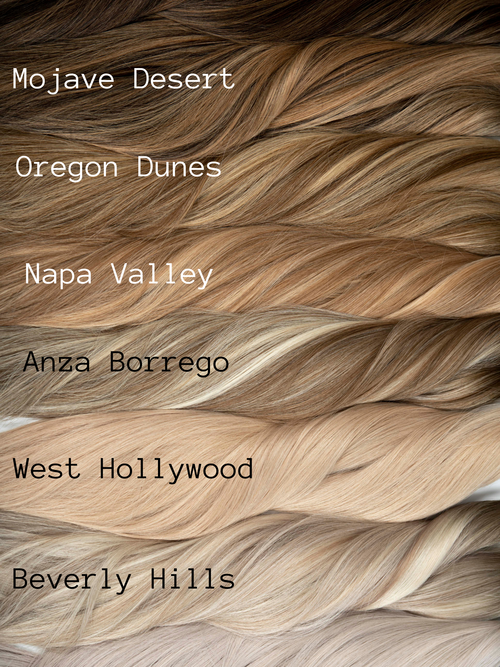(darkest to lightest)- Coeur D’Alene, Mojave Desert, Oregon Dunes, Napa Valley, Anza Borrego, West Hollywood, Beverly Hills, and North Pole